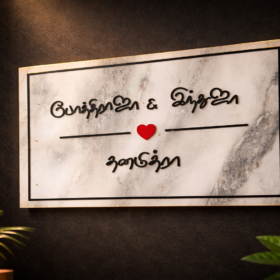 Premium Customized Wooden Name Plate with Golden Embossed Tamil Text & Decorative Design