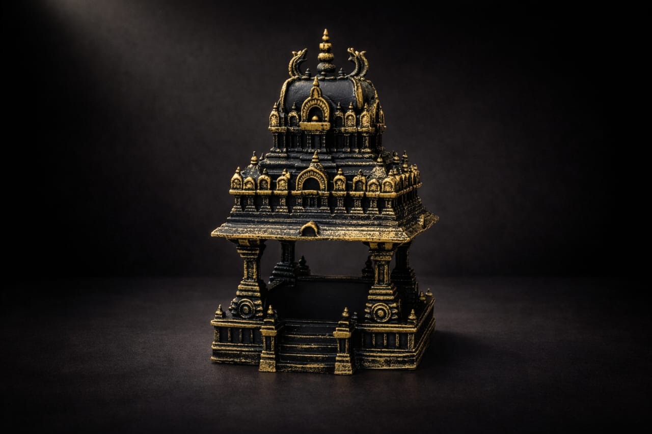 3D Printed Mini Temple Mandir – Black & Gold Decorative Hindu Mandir for Home & Office