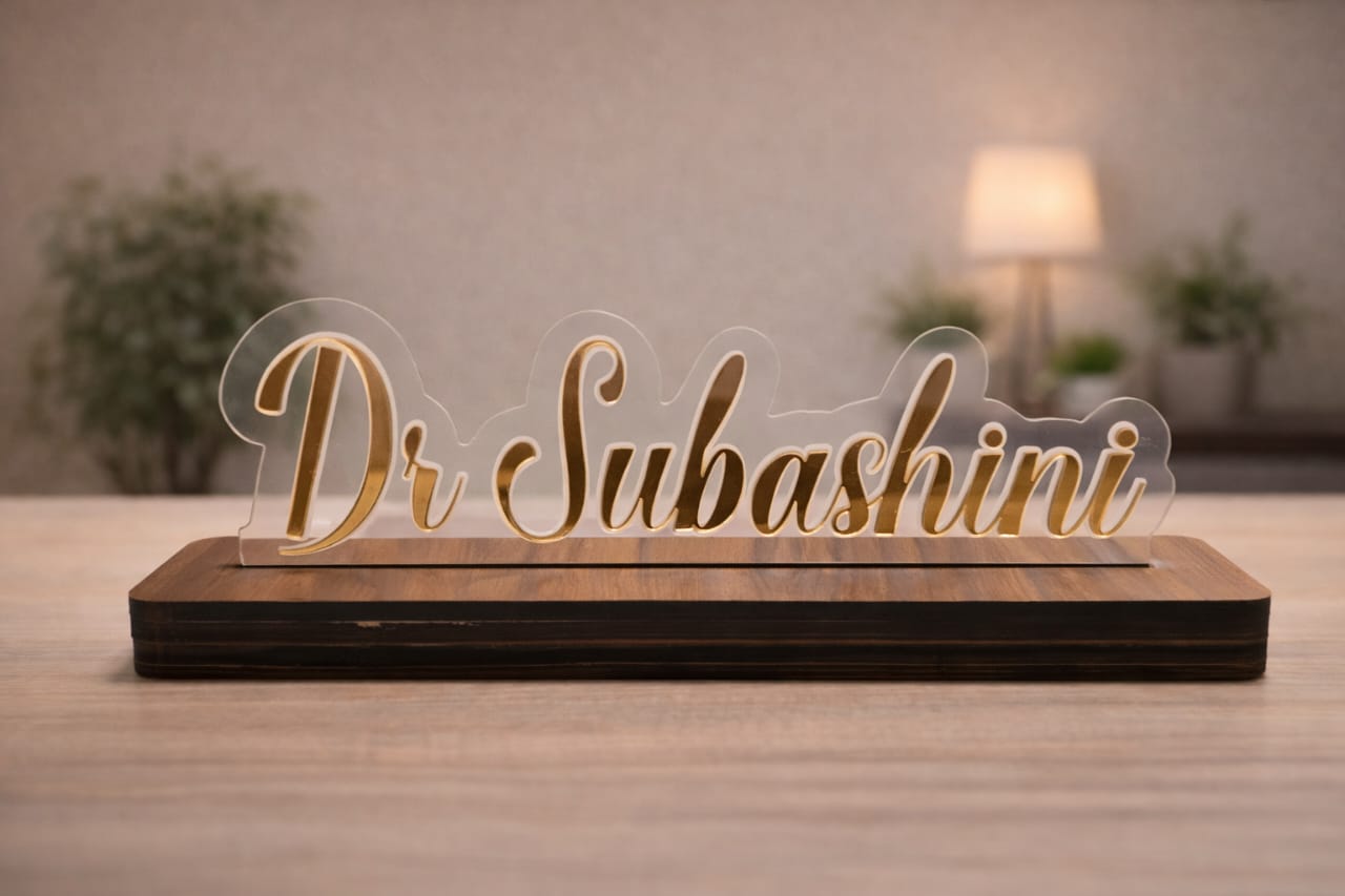 Make a bold statement at your workstation with the WOWOOD Customized LED Name Plate, which includes a custom icon, professional designation, and personalized name. This nameplate is ideal for corporate employees, advocates, teachers, pharmacists, chartered accountants, and physicians, as it is specifically designed to reflect your profession. The nameplate boasts a sleek appearance, thanks to its premium wood base and acrylic top, and the warm white LED lighting guarantees that your name is vividly illuminated. It is the ideal combination of design and functionality, making it a meaningful gift for professionals, as it is powered by an adapter.