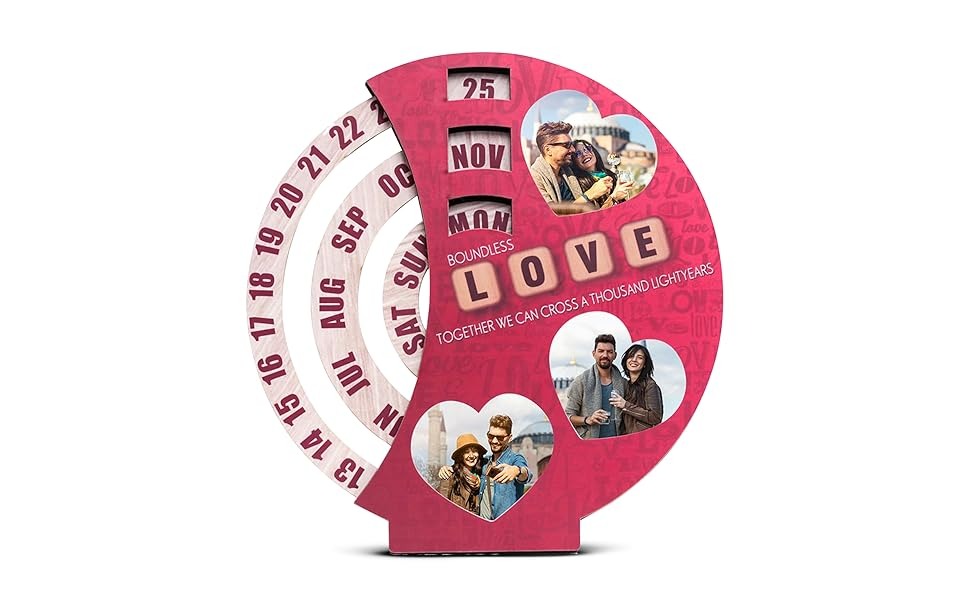 - PERSONALIZED WITH 3 PHOTOS – Customize this wooden rotating desk calendar with your favorite couple memories. A truly personal keepsake that celebrates love every day.