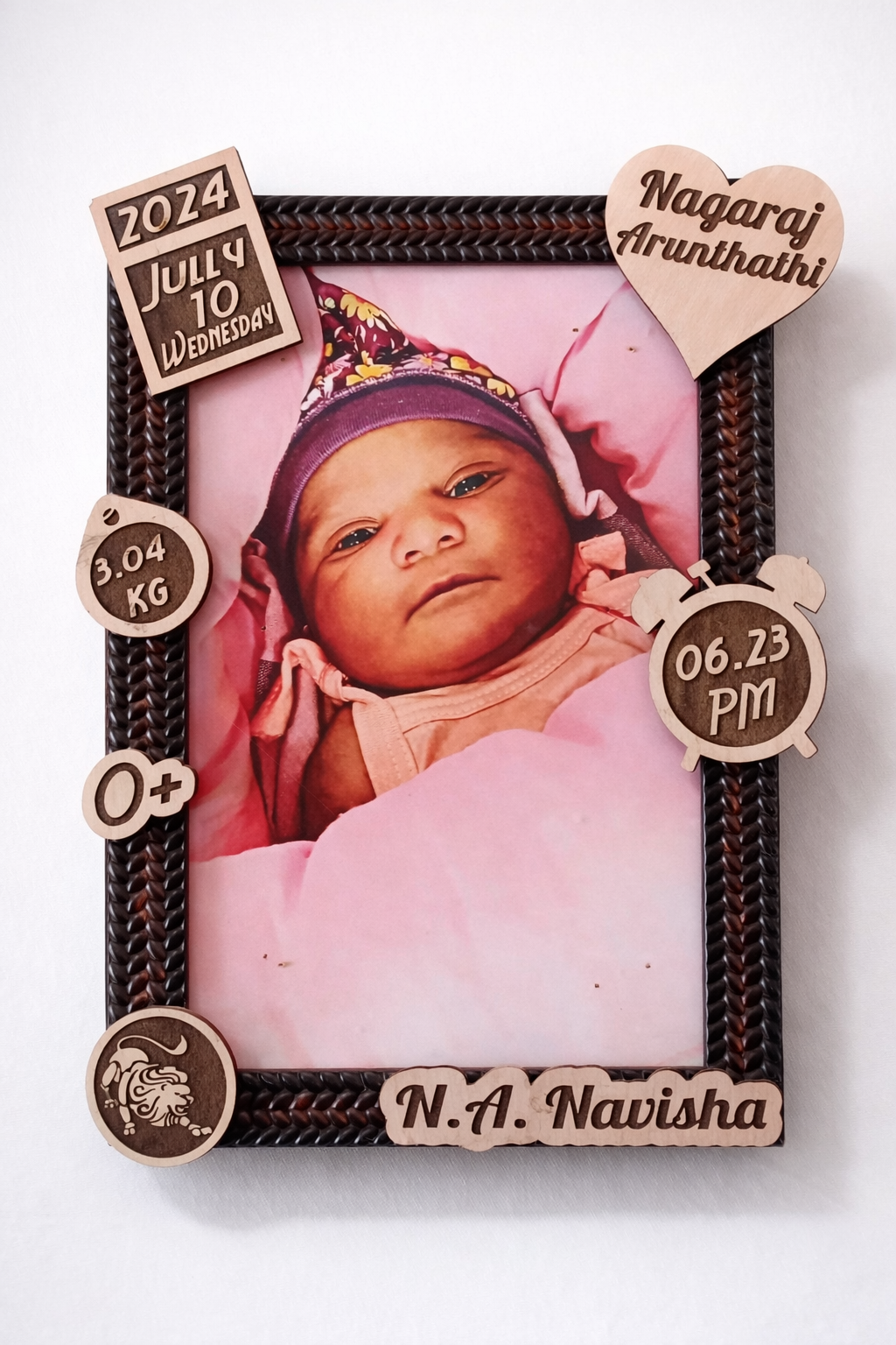 Preserve your baby’s most precious first moments with this personalized birth details photo frame. Designed with elegant wooden cutouts and a premium printed photo, this frame captures all the important information from your baby’s special day in a stylish and meaningful way.