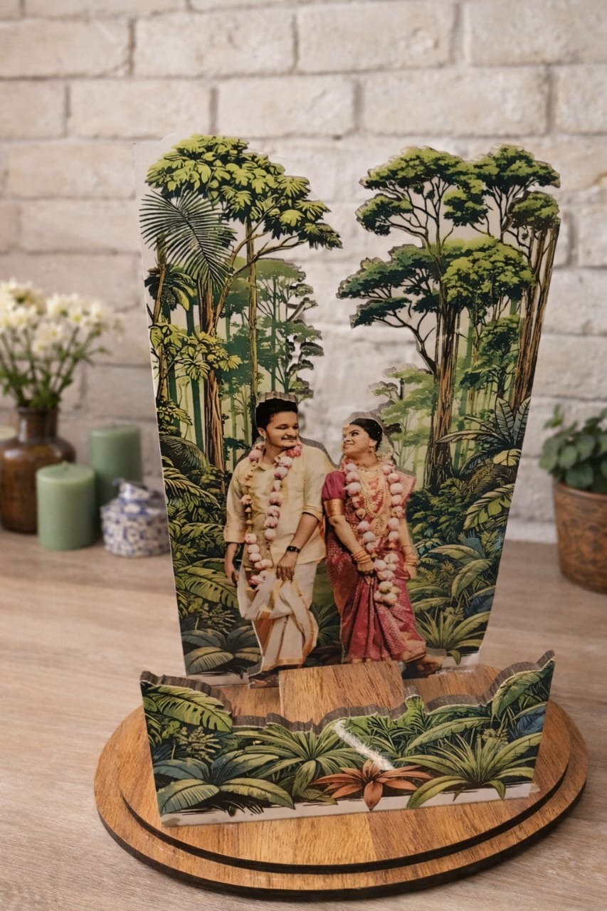The elegant wooden round base provides a sturdy platform, while the detailed jungle-style background adds depth and artistic charm. Your couple photo is placed in the center, making it a perfect keepsake to celebrate love and special occasions.